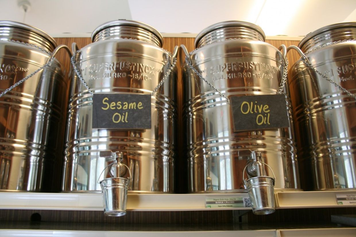 HOW: Food at Original Unpacked is sold mostly in bulk from gravity dispensers that line the walls of the supermarket. Customers simply press the handle on the dispenser to purchase exactly how much they need. Customers are also encouraged to bring their own containers from home, or they can purchase from the store.