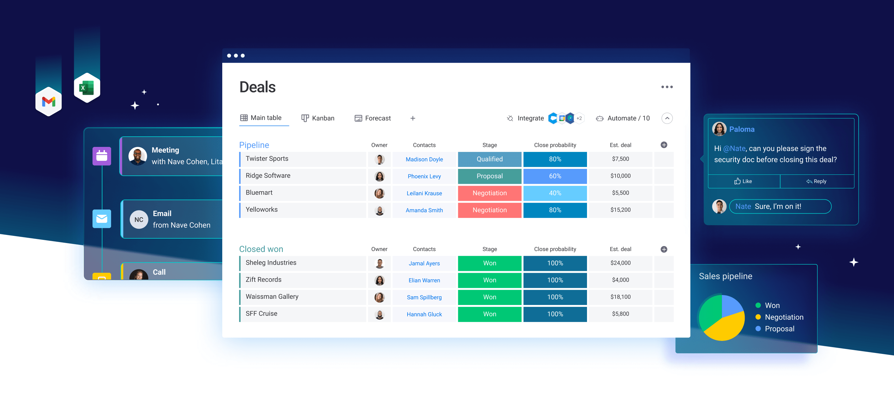 - Pipeline Management: Visualize your deals, leads, and projects in a customizable pipeline. Drag-and-drop functionality lets you easily move items through stages, ensuring nothing falls through the cracks.