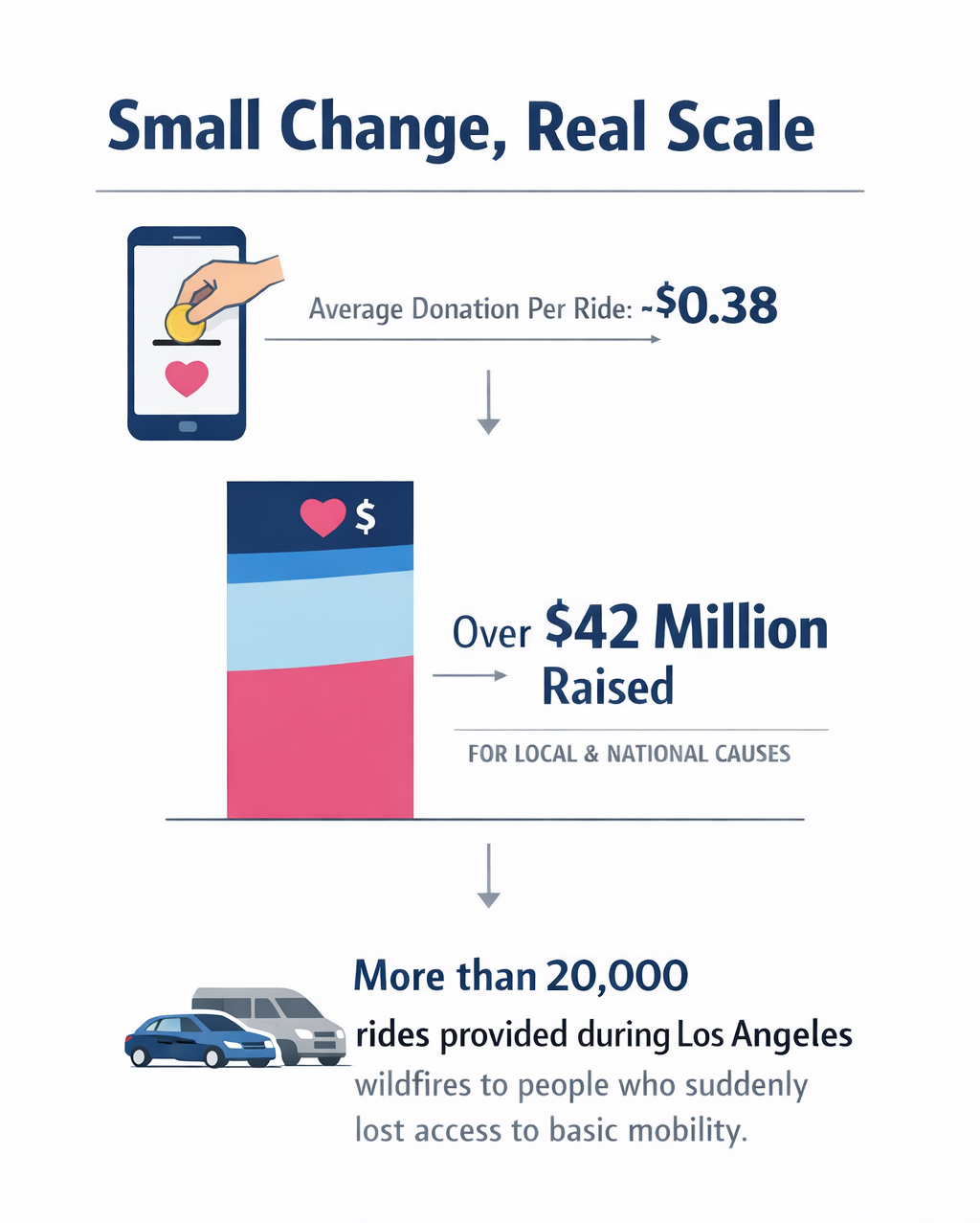 What makes that number notable is the average donation, roughly 38 cents per ride. It works because it is simple, voluntary, and consistent. On major moments like Giving Tuesday, Lyft has gone further, matching donations and even layering in personal matches from leadership.