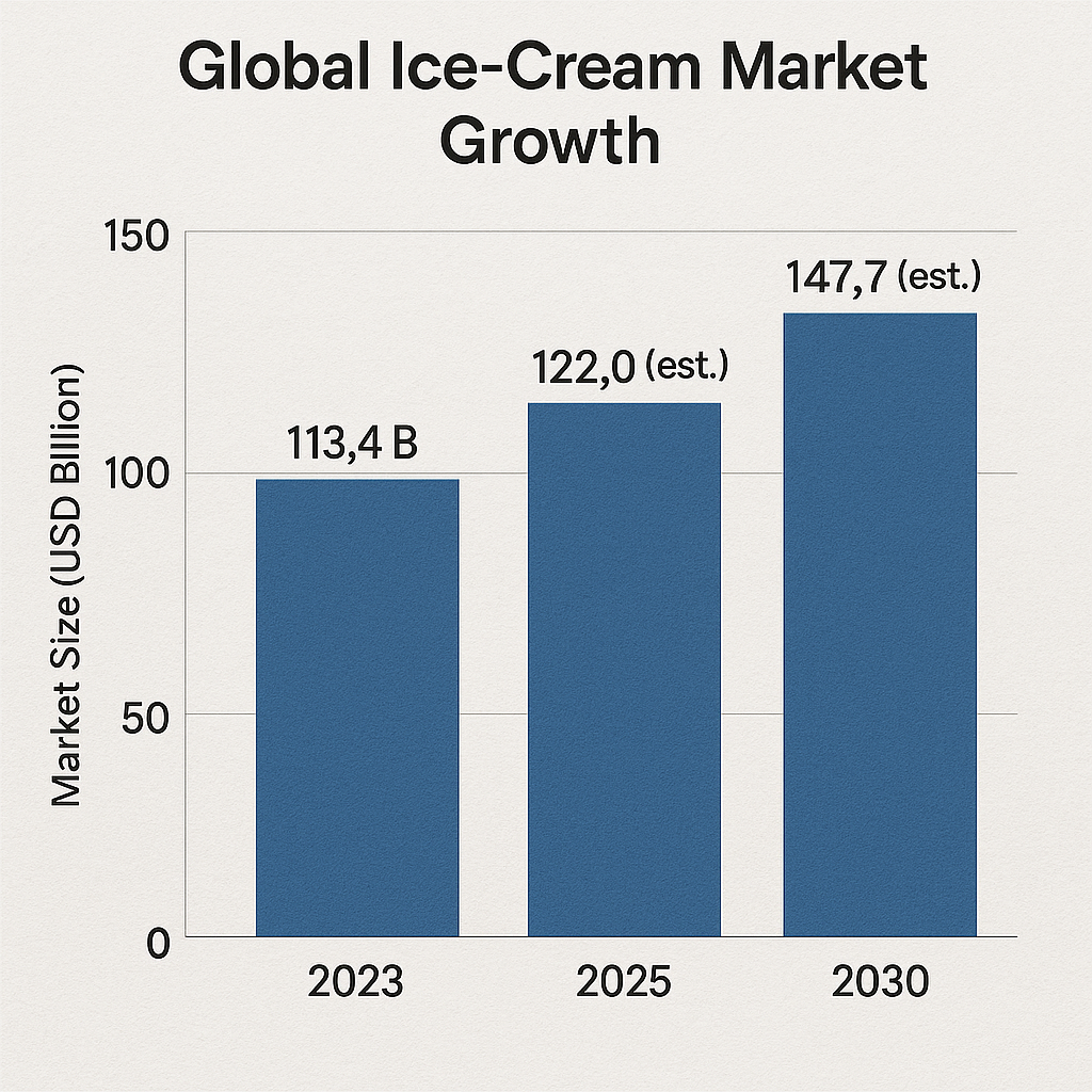The global ice-cream market (including frozen desserts) was estimated at USD 113.4 billion in 2023 and is projected to reach USD 147.74 billion by 2030, growing at a CAGR of ~3.9% from 2024-2030.