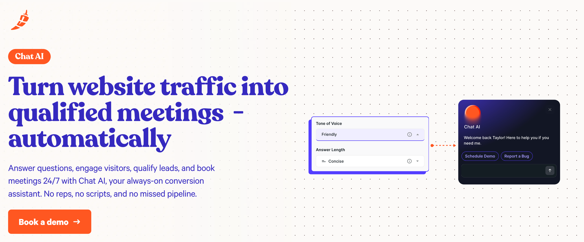 What it does: Chili Piper Chat AI is an intelligent conversational bot integrated into a website that instantly qualifies inbound leads based on defined criteria and automatically books them a meeting with the correct sales or success representative, directly from the chat window.