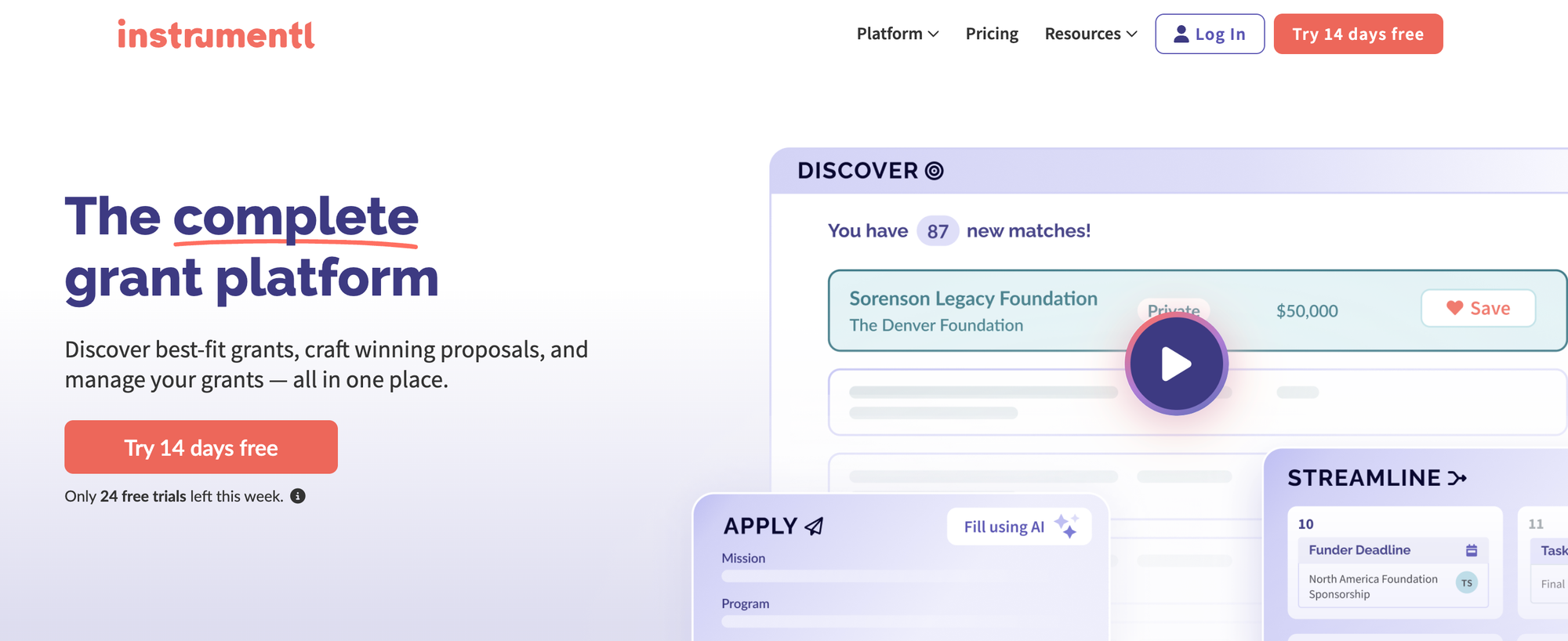 What it does: Instrumentl is a comprehensive grant management and prospecting platform that helps nonprofit teams find, track, and win grants more efficiently. It combines foundation research with project tracking and reporting tools in one centralized hub.