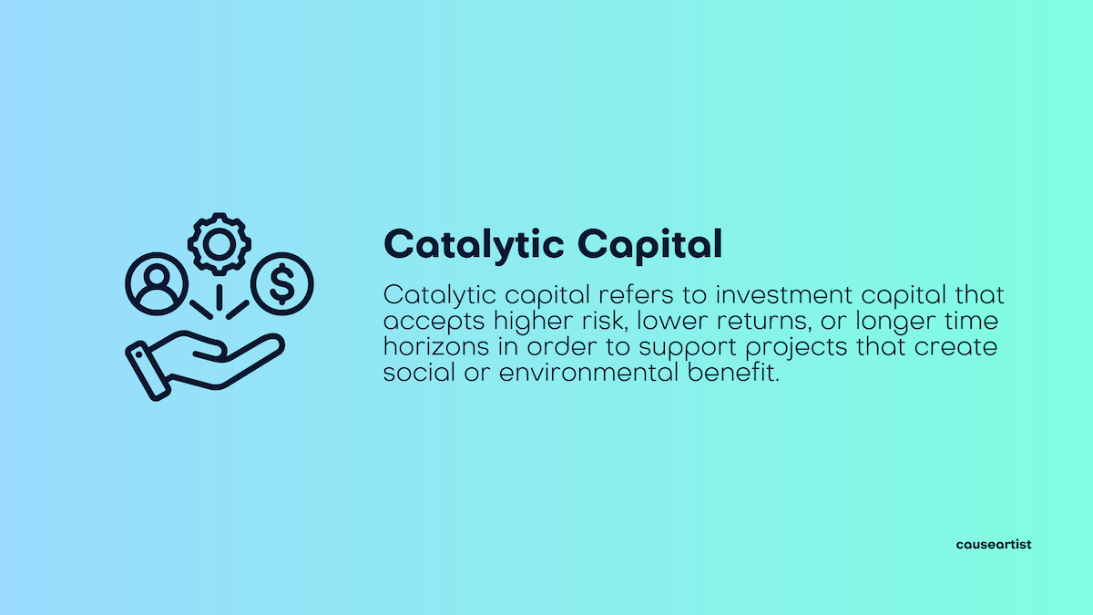 Catalytic capital refers to investment capital that accepts higher risk, lower returns, or longer time horizons in order to support projects that create social or environmental benefit.