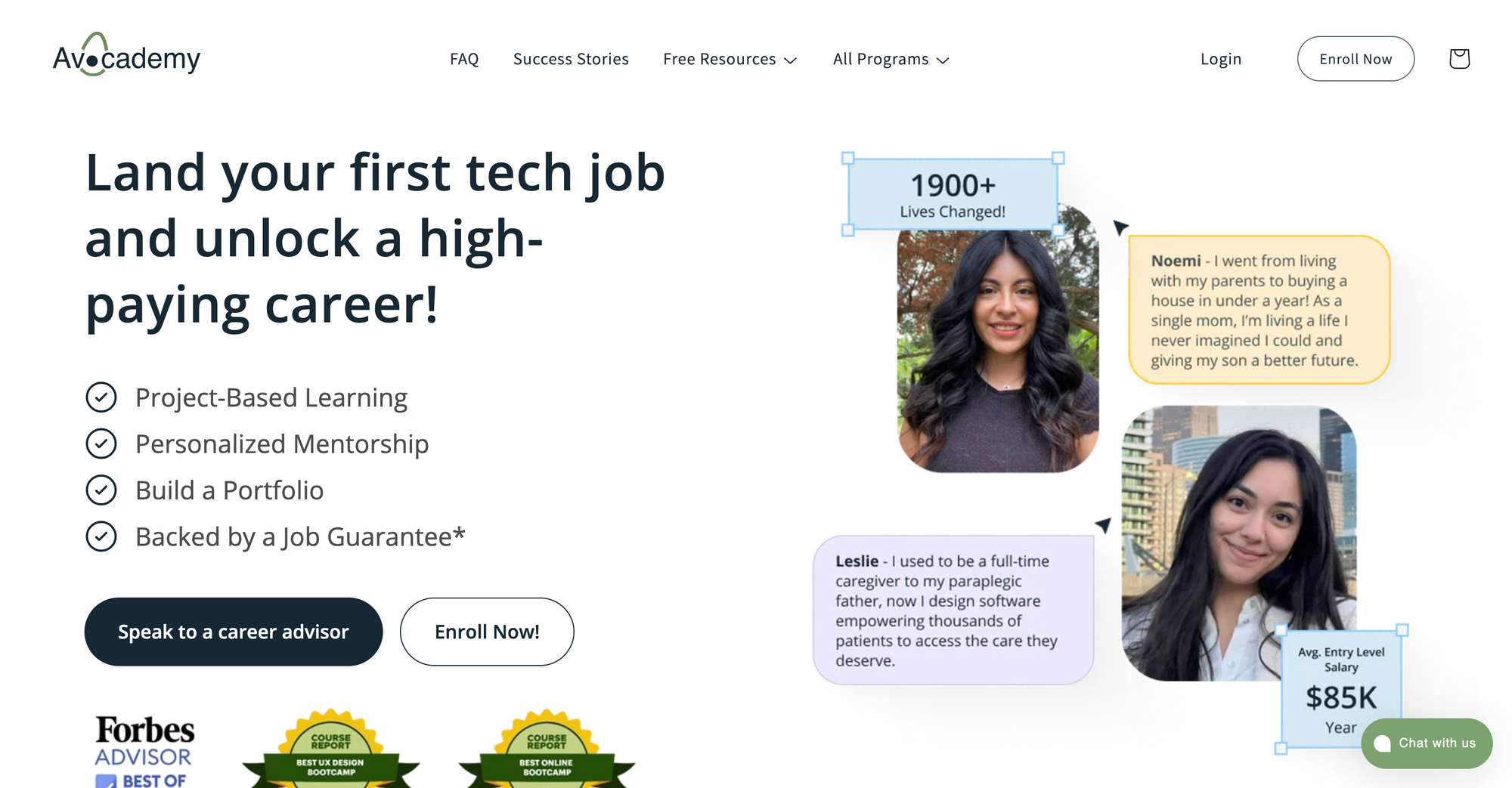 Combining project-based learning, personalized mentorship, and hands-on experience, Avocademy prepares you to land your first tech job with confidence and unlock a high-paying career—backed by job placement.
