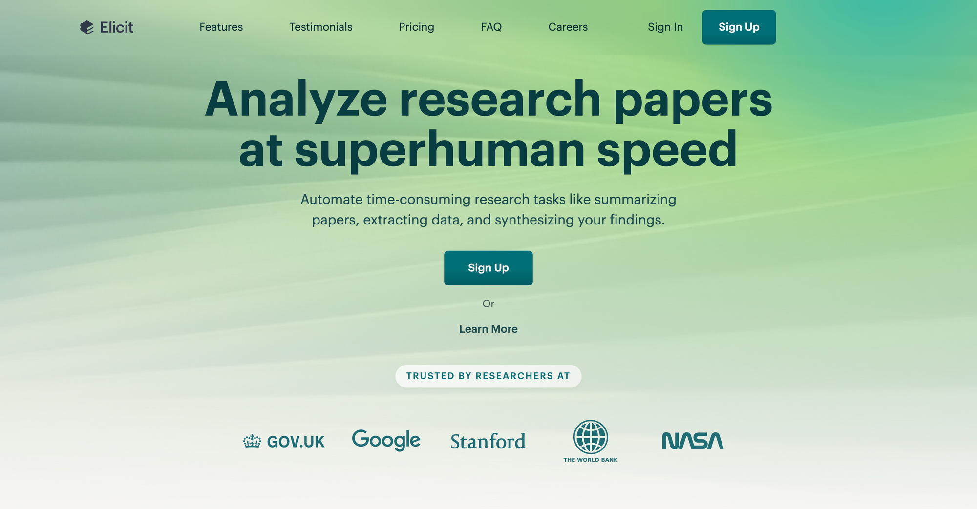 Elicit automates time-consuming research tasks, allowing you to summarize papers, extract data, and synthesize findings faster than ever. Trusted by researchers worldwide, Elicit is the go-to platform for professionals who need to analyze academic papers at superhuman speed.