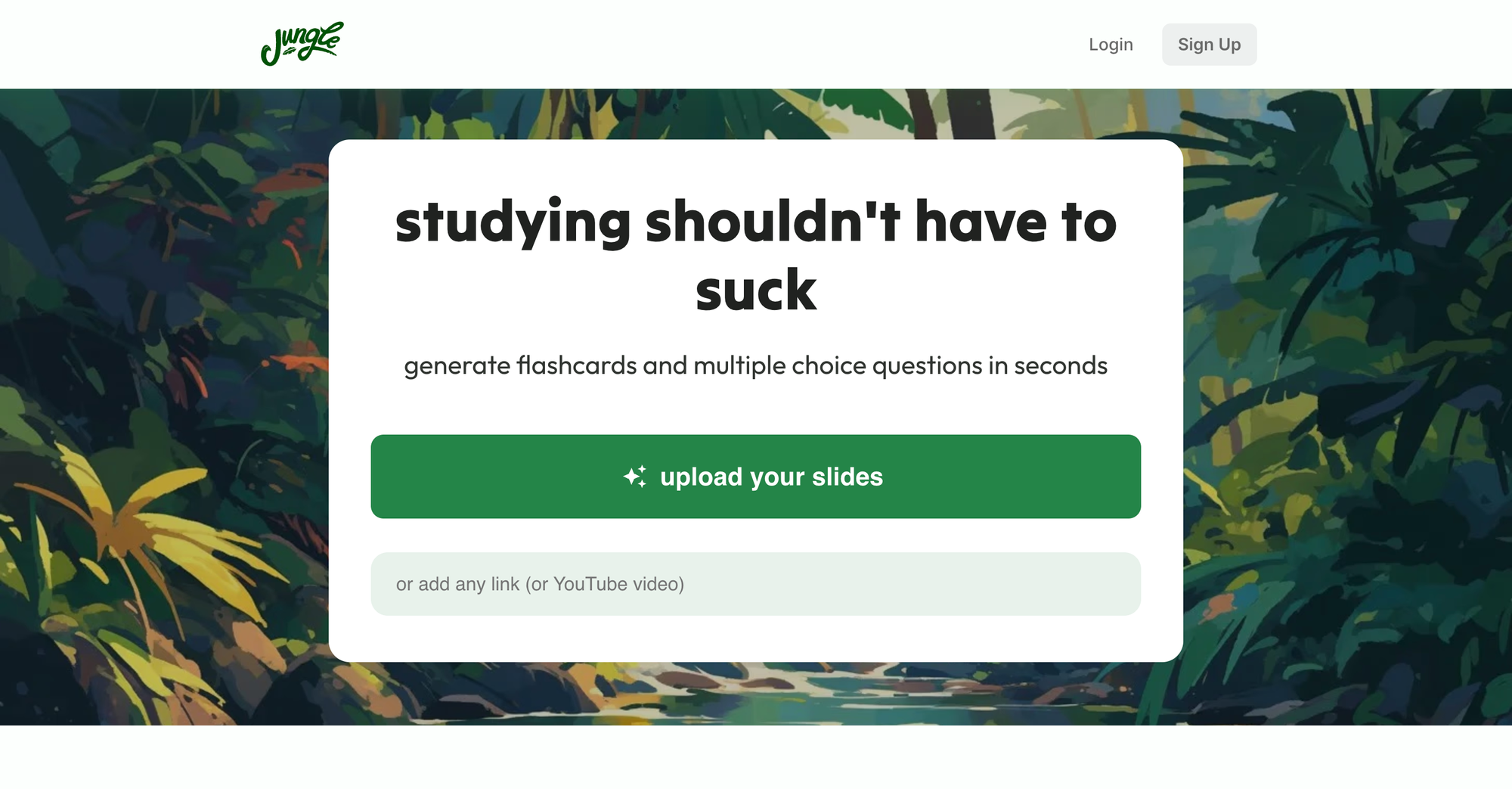Jungle AI makes studying efficient, personalized, and enjoyable for students. Trusted by over 500,000 users, Jungle transforms your learning materials into practice questions that work best for you—whether it's multiple choice, free response, or case-based questions. Say goodbye to boring study sessions and hello to smarter learning!