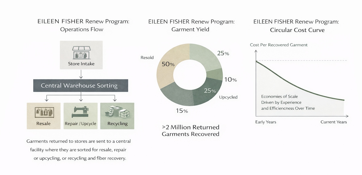 Eileen Fisher demonstrates that circularity is not a brand narrative, it is an operational system. The take-back program required investment in logistics, warehousing, sorting, repair labor, and new pricing models. It also required cultural buy-in across the organization.