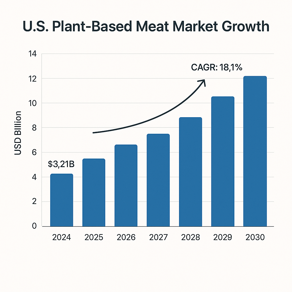 - In the U.S., the plant-based meat market was estimated at USD 3.21 billion in 2024, and expected to grow at a CAGR of ~18.1% through 2030.
