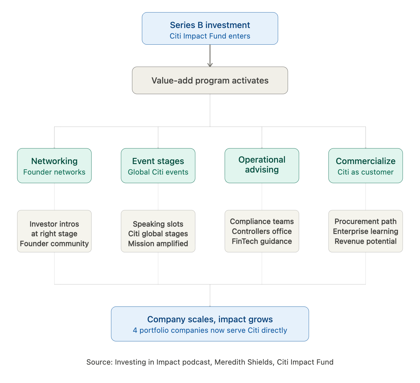 At the Series B stage, Shields and her team can do things that genuinely move the needle. They've placed founders on Citi event stages in front of the right audiences. They've connected portfolio companies with Citi's compliance and controller teams for guidance. In a few cases, Citi itself has become a paying customer of portfolio companies after running them through procurement.