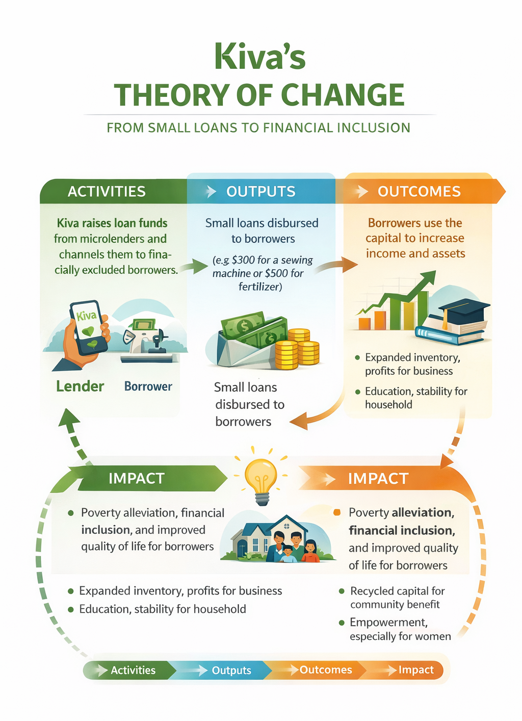 At the activity level, Kiva raises loan funds from a broad base of microlenders and channels those funds to creditworthy but financially excluded borrowers. The immediate outputs are the loans disbursed – e.g., a $300 loan to a tailor to buy a new sewing machine, or a $500 loan to a farmer to purchase fertilizer.