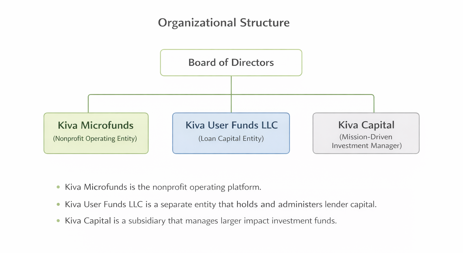 Kiva also adjusted its organizational structure to support its mission: it created separate legal entities like Kiva Microfunds (the 501c3 nonprofit), Kiva User Funds LLC (to hold lenders’ revolving loan funds securely), and Kiva DAF LLC (to manage donor-advised funds and institutional lending capital).