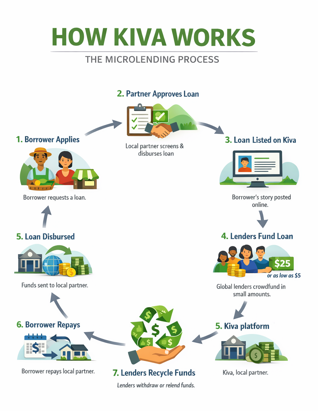 Kiva’s primary program model is an online microlending platform that brings together individual lenders and underserved borrowers. The mechanics are as follows: