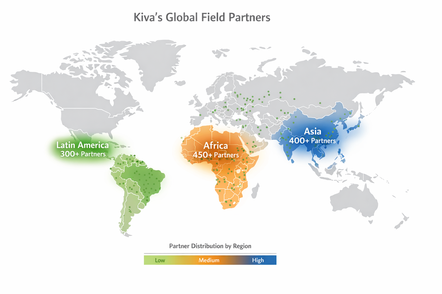 Kiva monitors partners’ performance and limits their borrowing capacity based on factors like repayment history. This partnership model extends Kiva’s reach globally without the need for Kiva to open branch offices everywhere.