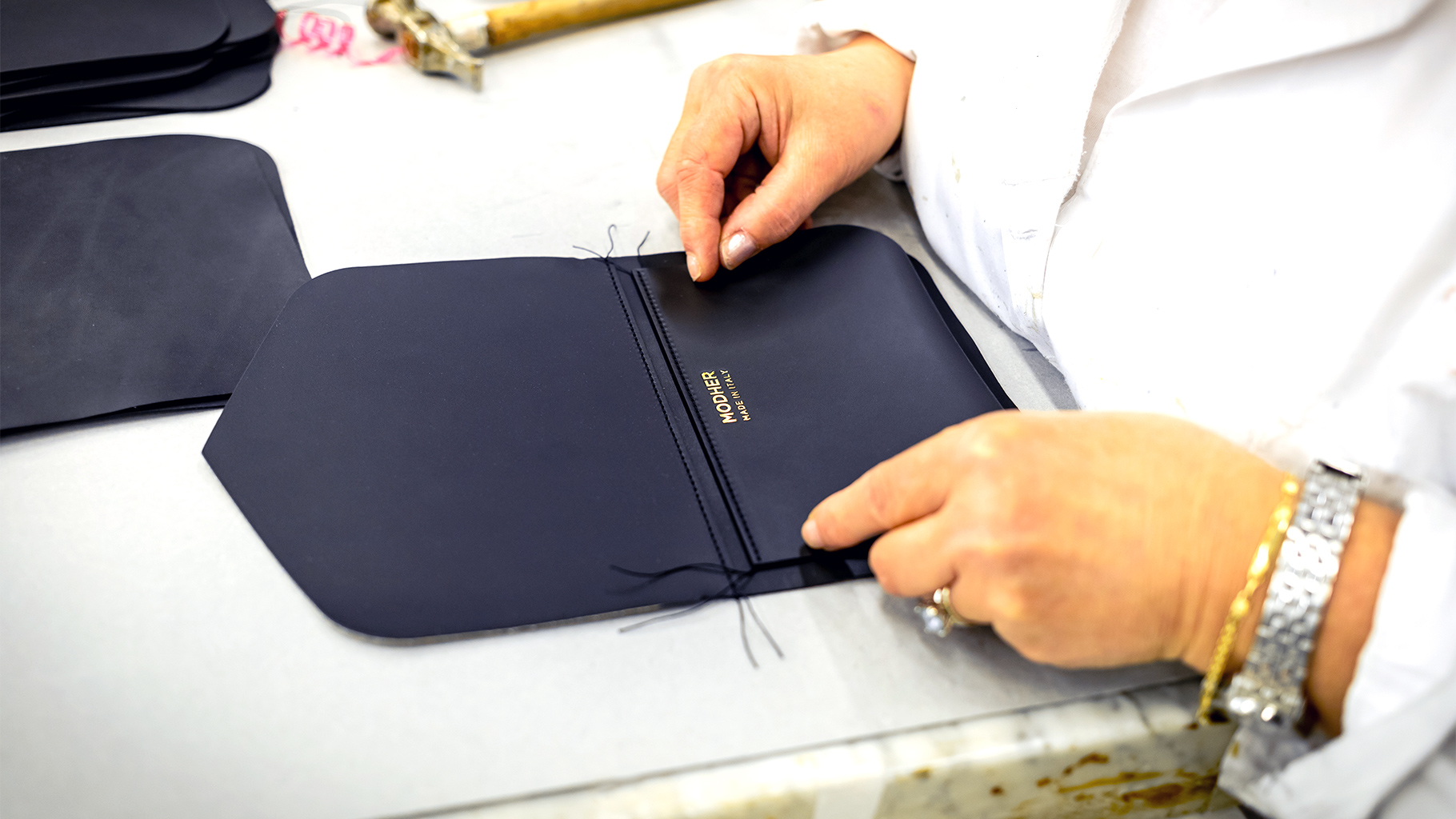 Before finalizing their partnership, MODHER’s founders were able to visit and tour Andrea’s workshop. They saw that he not only had the proper equipment for crafting beautiful bags, but he was also taking measures to ensure the safety of his workforce. The workshop balanced traditional and cutting-edge technologies: from a cast-iron press used since the 50s to CAD: cutting plotters that allow flexibility in the production.