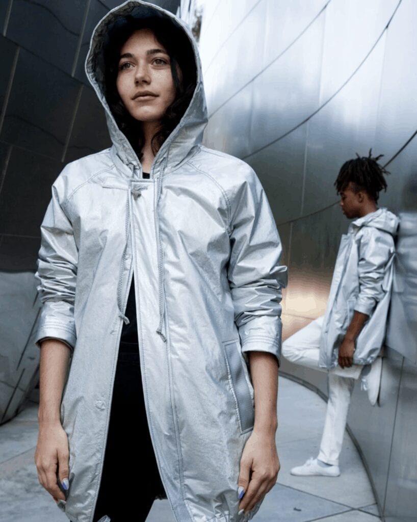 The jacket’s silver fabric was originally used by the shipping industry as a cover that protected vehicles on a single journey across the Pacific. Designed to withstand the elements, it’s salt-waterproof, UV-protected, and reflective to shield from both salt and sun. These incredible protective properties lead to a major downside: the material will never decompose in a landfill and is impossible to recycle.