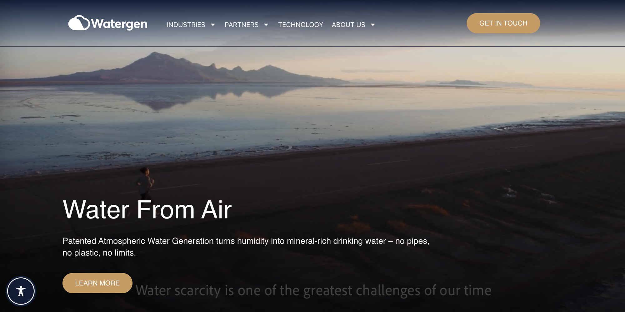 Watergen has developed atmospheric water generation (AWG) systems that extract humidity from air to produce clean drinking water. Its scalable units serve homes, hospitals, schools, and entire communities.