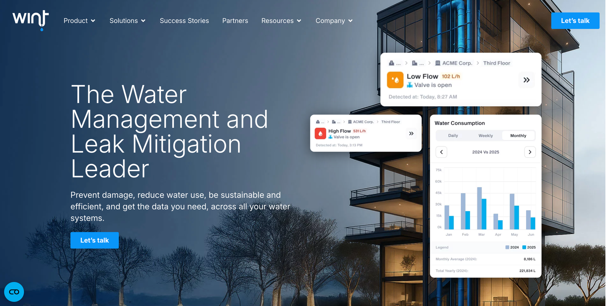 WINT Water Intelligence prevents water waste before it happens. Its AI-powered sensors and shutoff valves detect leaks, identify anomalies, and automatically stop the flow to prevent damage.